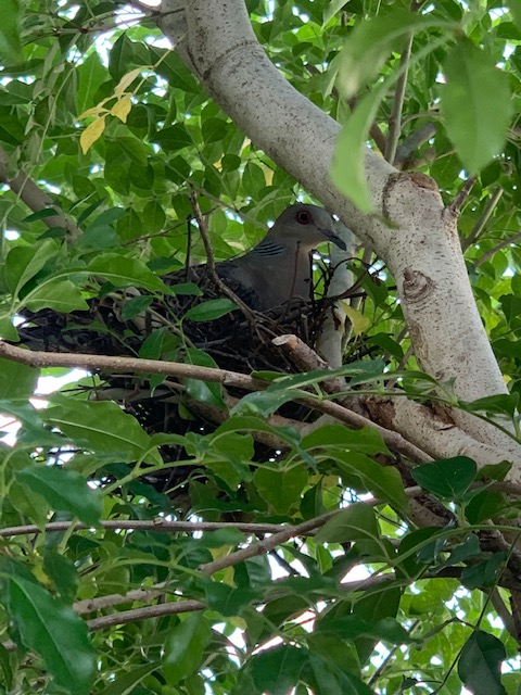 アドニスのシマトネリコに1匹の鳩が飛んでいたのでよく見ると、キジバトが巣をつくっていました。